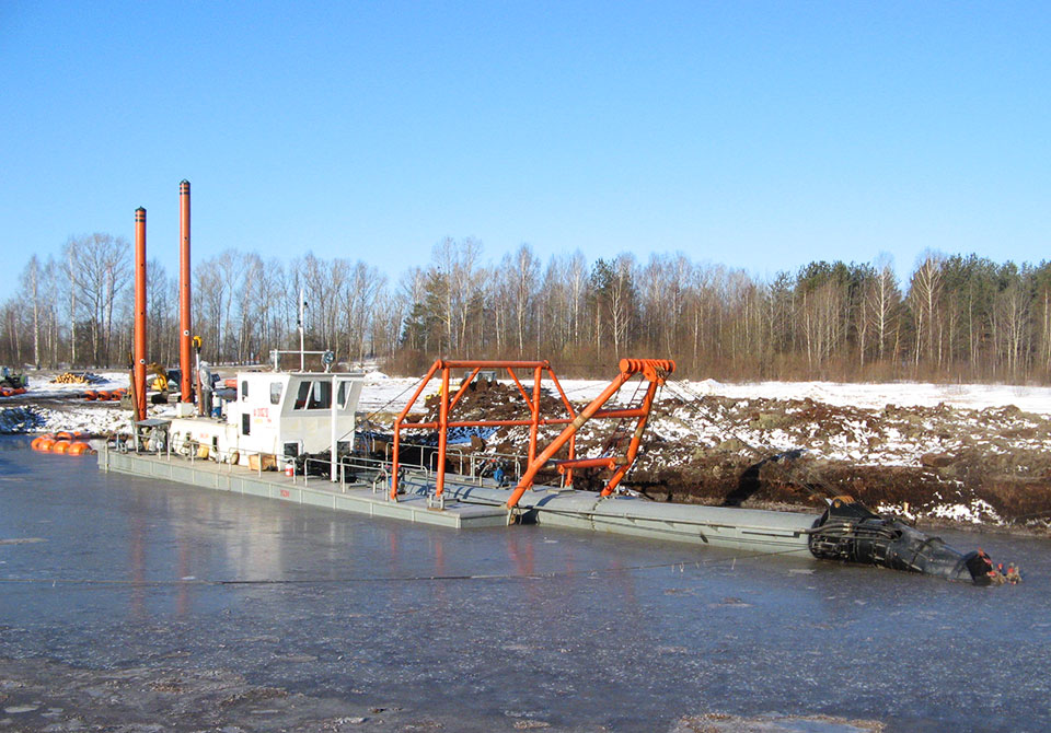 ① 挖泥船可以拼裝的分體式結構,利用冬季地面冰凍期運輸到目的地,在5月上旬地面化凍之前完成拼裝;
